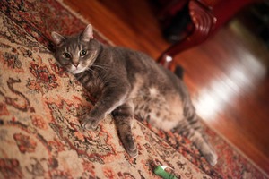 A gray cat lounges comfortably on a richly patterned rug, its gaze captivating and curious. The warm, ambient lighting enhances a cozy atmosphere, highlighting the cat's soft fur and relaxed posture. The composition draws the eye to the feline's playful demeanor, inviting a sense of tranquility and homey charm.