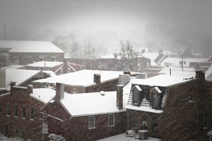 In this photograph, rooftops blanketed in snow create a tranquil winter scene, enveloped by a soft, almost ethereal haze. The muted tones and swirling snowfall evoke a sense of stillness and isolation, transforming the familiar neighborhood into a serene, wintry landscape. The layered composition of rooftops adds depth, inviting the viewer to contemplate the peaceful, yet stark beauty of a snowstorm.