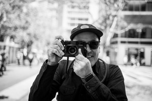 A smiling man with sunglasses and a cap holds a camera aimed directly at the viewer, exuding a sense of joy and enthusiasm. The blurred background suggests a lively urban environment, enhancing the candid nature of the scene. The monochrome tones create a nostalgic mood, highlighting expressions and textures without distraction.