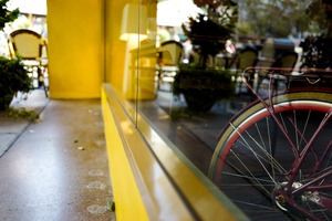 This photograph captures a tranquil moment outside a café, with a vibrant yellow wall framing the scene. The composition cleverly incorporates the reflection of a bicycle's wheel, subtly merging urban life with the inviting atmosphere of the café's outdoor seating. Soft natural light enhances the colors, evoking a sense of warmth and relaxation.