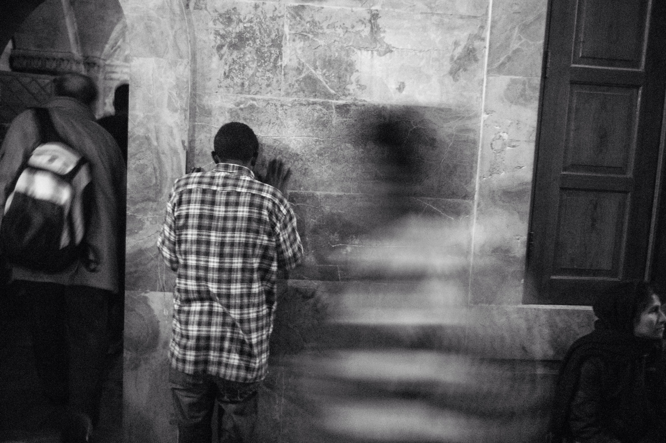 In a dimly lit space, a lone figure in a plaid shirt leans against a textured wall, evoking a moment of introspection. Surrounding shadows blur into motion, suggesting a world in flux, contrasting the stillness of the subject. The monochrome palette amplifies the mood, creating an evocative sense of solitude amidst the hustle of life.