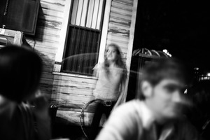 In this dynamic nighttime scene, a young woman captures attention as she twirls a hula hoop, exuding a playful energy. The blurred motion creates an ethereal quality, contrasting with the sharp focus on the figures in the foreground, evoking a sense of nostalgia and spontaneity. The black-and-white composition enhances the mood, amplifying the warmth of human connection amidst the enigmatic ambiance.