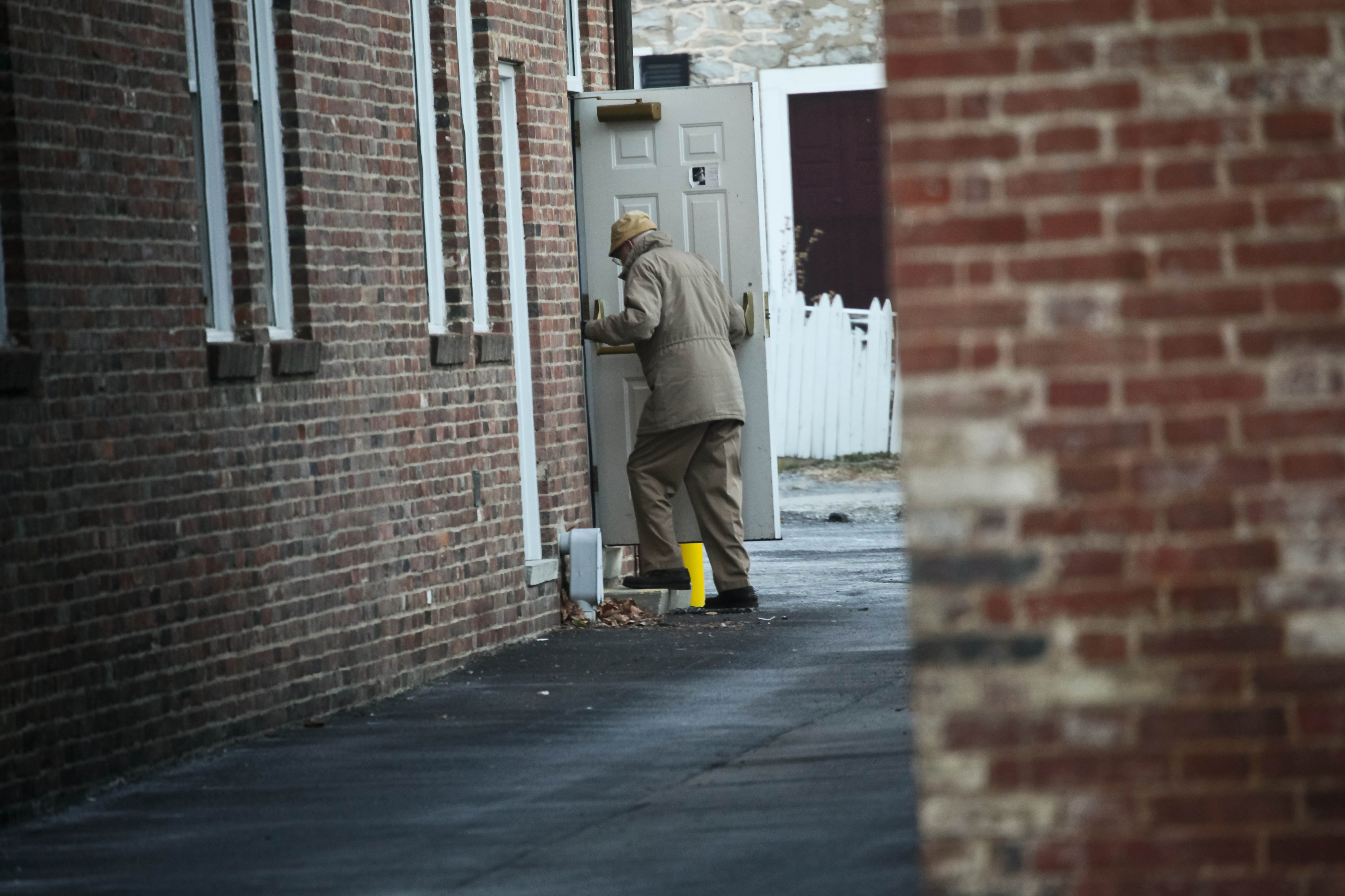 An elderly man, clad in a tan coat and hat, leans towards an open door nestled between two rugged brick walls. The scene, bathed in soft, muted light, evokes a sense of nostalgia and solitude, capturing the quiet moments of life's journey. The contrasting warmth of his outfit against the cool tones of the surroundings adds to the introspective mood.