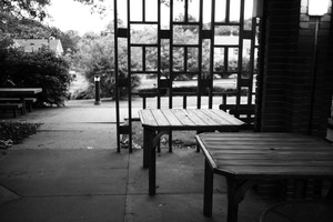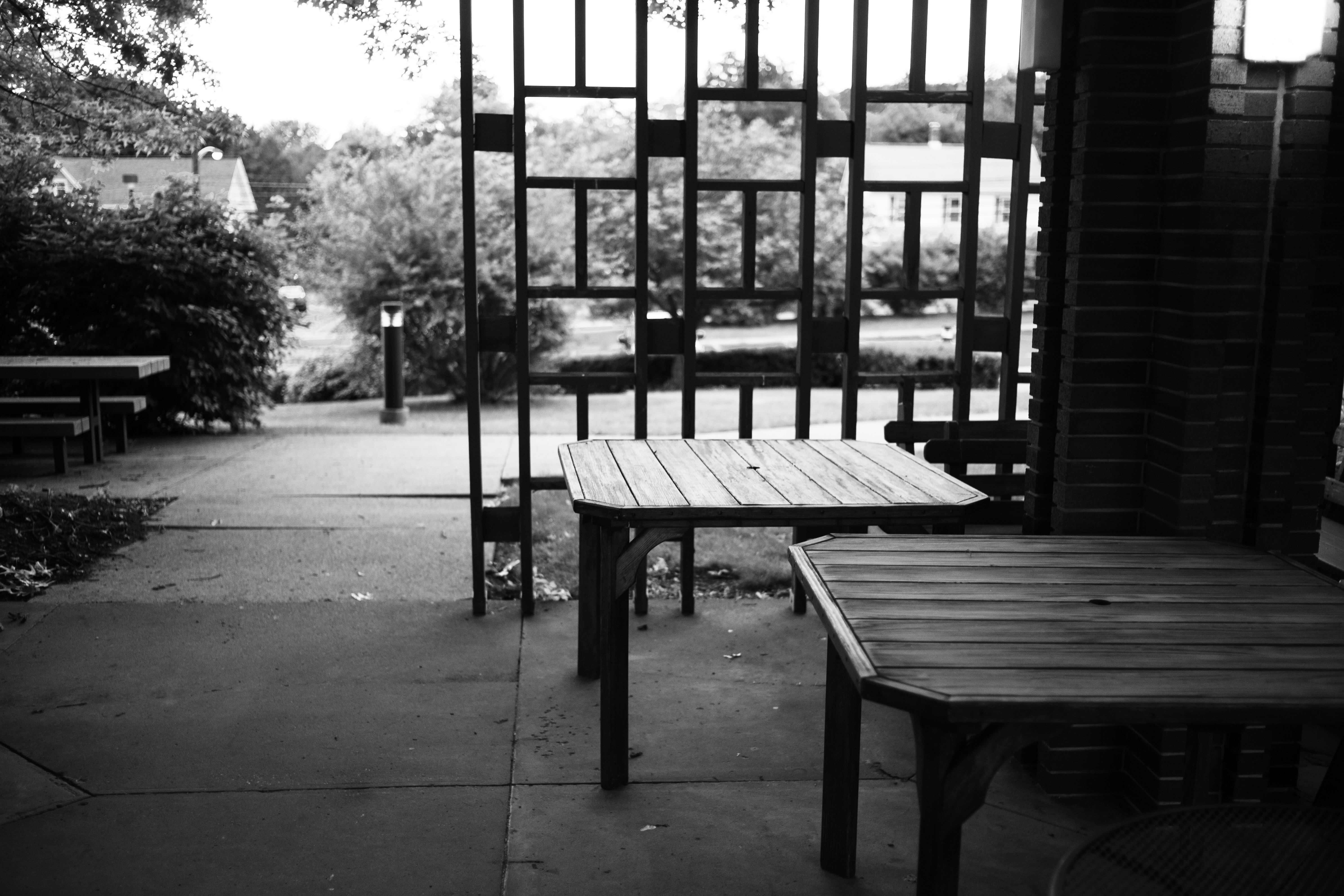 This monochrome photograph evokes a serene, contemplative mood, featuring two wooden tables positioned beneath a striking geometric screen. The soft, diffused lighting highlights the textures of the wood and the surrounding greenery, creating a sense of calm. The composition invites the viewer to reflect on the tranquil outdoor space, hinting at moments of connection and conversation yet to come.