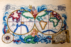 This intricate piece showcases a vibrant, embroidered world map, framed by swirling waves and mythical figures. The colors are rich and playful, creating a whimsical atmosphere that invites exploration and curiosity. Sunlight delicately illuminates the fabric, enhancing the textured stitches and adding warmth to the scene.