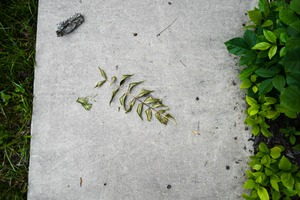This photograph captures a delicate arrangement of dried leaves, artfully placed on a concrete surface. The juxtaposition of the organic shapes against the stark, gray background evokes a sense of quiet beauty and impermanence, while the vibrant greenery on one side adds a touch of life and contrast. Soft, natural lighting enhances the textures, creating a serene and contemplative mood.