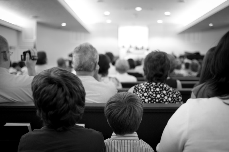 In this monochromatic photograph, the focus is on a group of adults facing a stage, with two children positioned in the foreground, their backs turned to the viewer. The atmosphere conveys a sense of contemplation and anticipation, as soft lighting casts gentle shadows across the scene, enhancing the intimacy of the moment. The tight composition draws the eye to the curious expressions of the children, capturing a shared experience rooted in attentiveness and wonder.