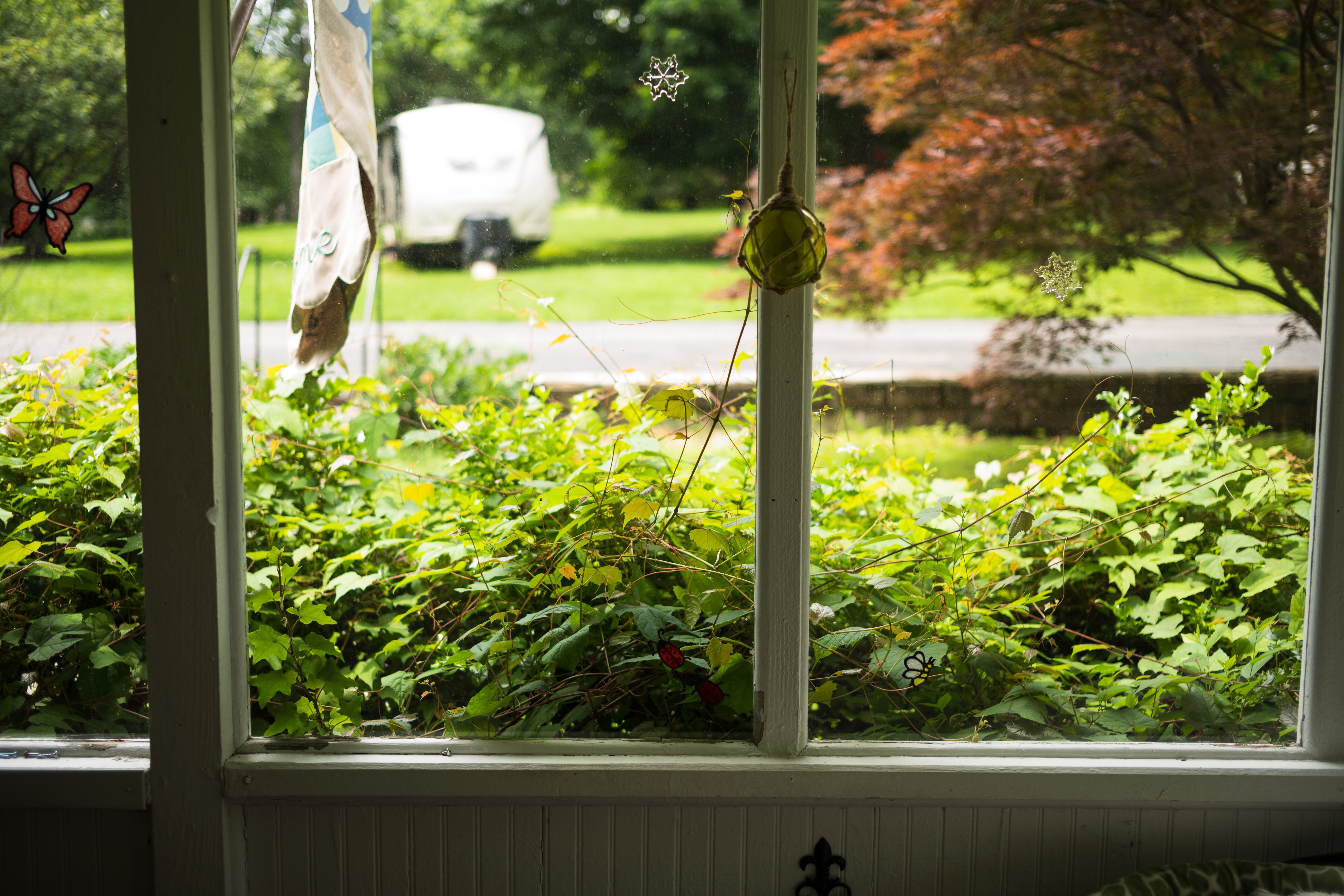 Framed by a rustic window, lush green vines spill over the base, inviting a serene connection with the outdoors. Gentle light filters through, casting a warm glow that enhances the tranquil mood of this intimate space. Beyond the glass, a hint of a trailer and soft foliage completes the scene, evoking a sense of peaceful retreat.