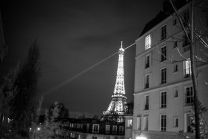 This striking black and white photograph captures the Eiffel Tower's illuminated silhouette against a darkened Parisian skyline. The composition is enhanced by the sharp contrast of light, producing a moody and romantic ambiance as subtle reflections can be seen in nearby windows. The scene evokes a sense of timeless elegance, inviting viewers to imagine the vibrant life of the city at night.