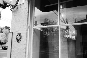 The photograph captures a quaint storefront window adorned with a welcoming 'Open' sign, hinting at life within. Black and white tones evoke a nostalgic, contemplative mood, while reflections in the glass suggest a quiet street scene outside. The composition emphasizes the subtle details of urban life, inviting curiosity among passersby.