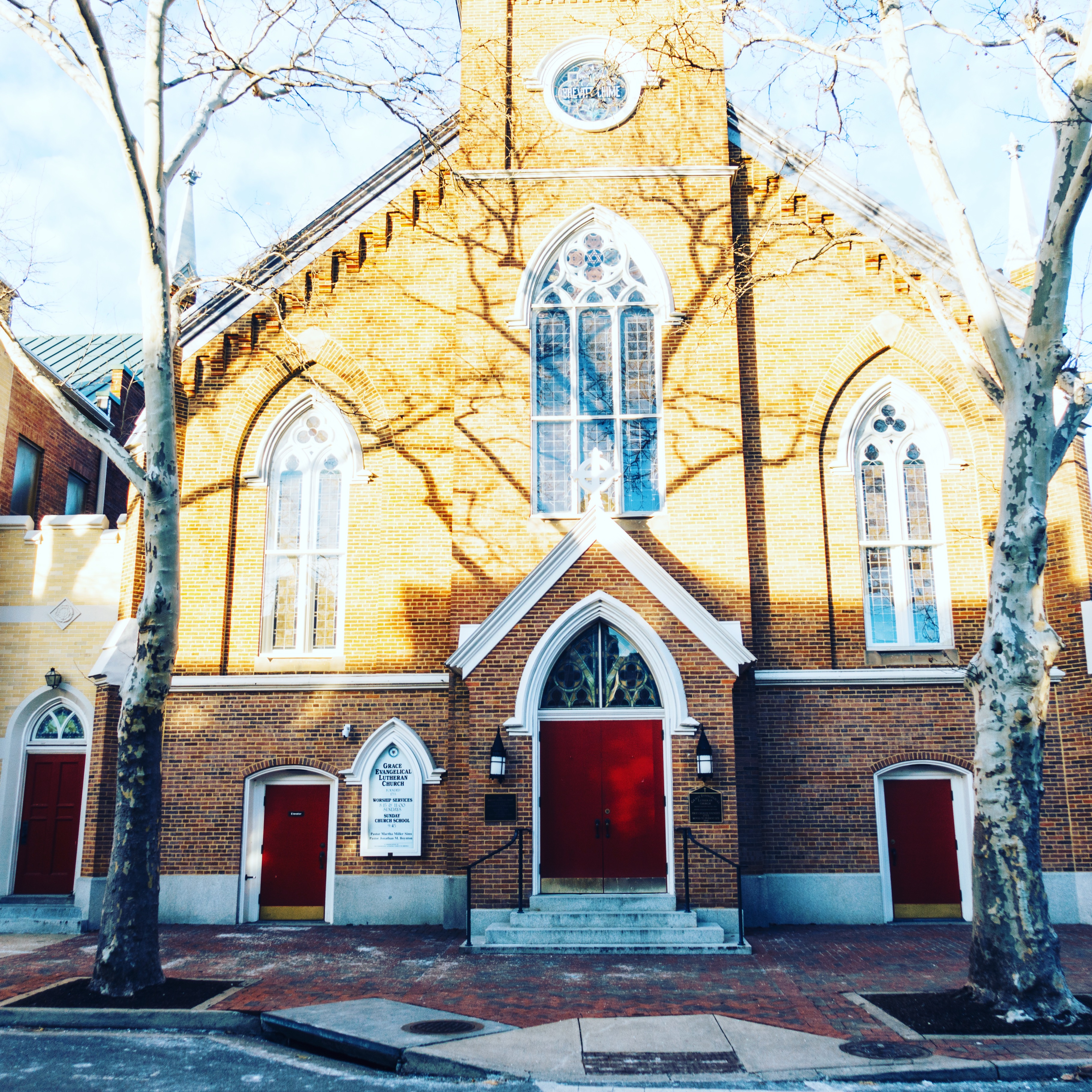 This photograph captures a charming brick church characterized by its neat Gothic architecture. The warm sunlight casts intricate shadows from the bare trees, creating a serene yet vibrant mood, while the striking red doors offer a welcoming contrast to the earthy tones of the structure. The composition balances architectural lines with natural forms, evoking a sense of tranquility and reflection.