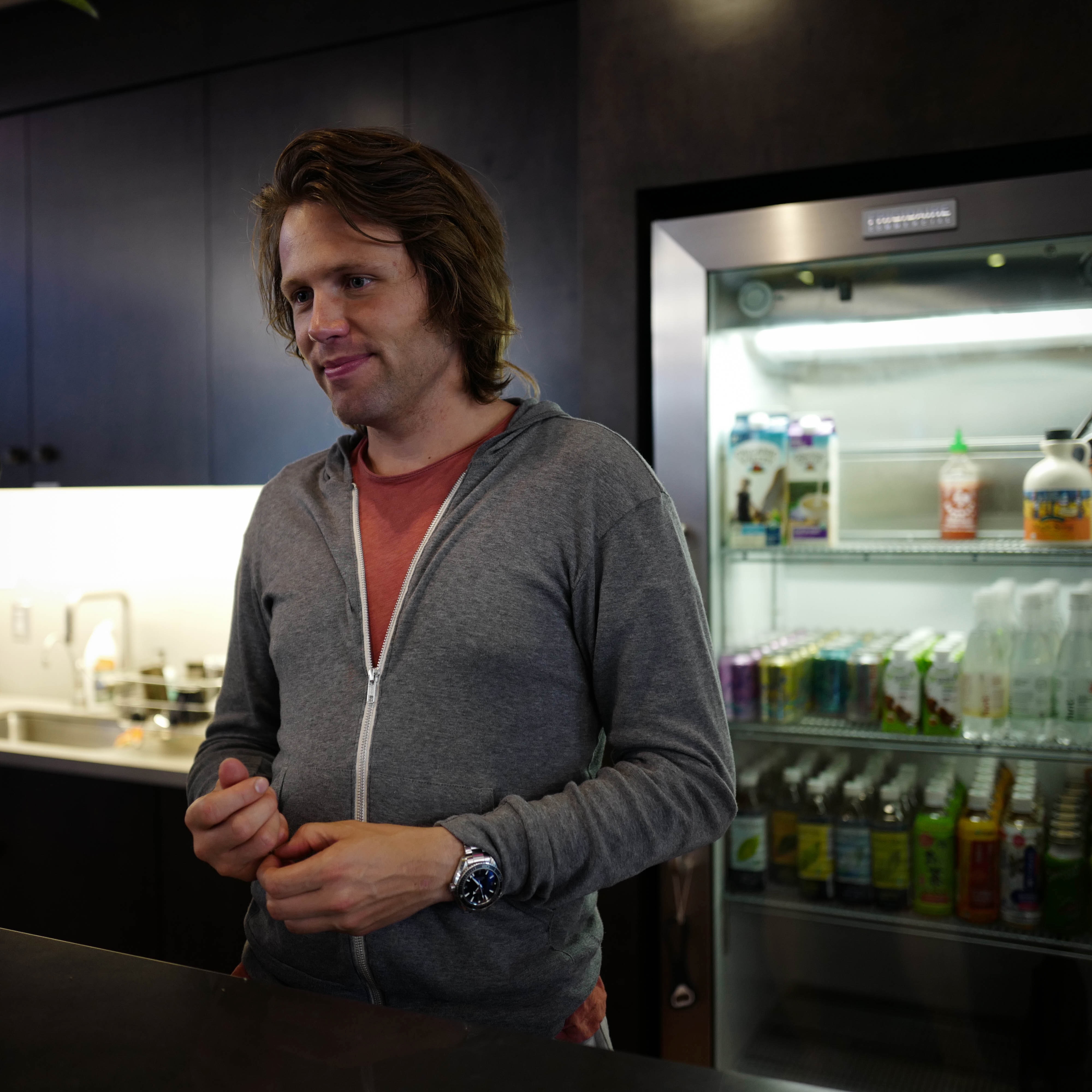 In a modern café setting, a casually dressed man stands at the counter, exuding a sense of relaxed thoughtfulness. The subdued lighting softly highlights his features, while the glimmer of a well-stocked refrigerator in the background adds a pop of color to the muted surroundings. The overall mood feels intimate and inviting, capturing a moment of quiet connection amidst the bustling atmosphere.