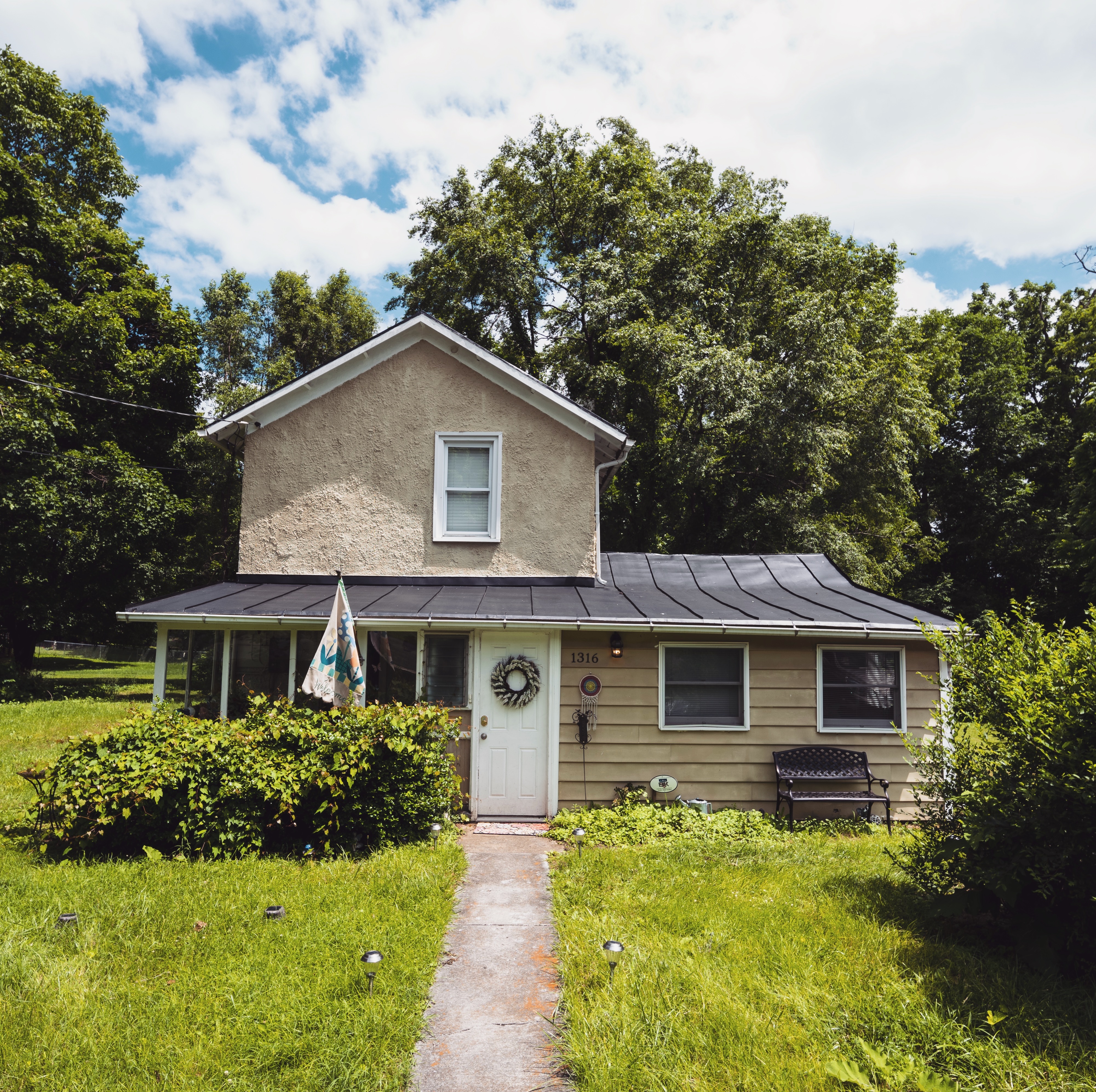 This quaint two-story house, surrounded by lush greenery, exudes a sense of warmth and tranquility. The soft, dappled sunlight filtering through the trees creates a serene atmosphere, while the inviting front path leads toward a home that feels both lived-in and lovingly maintained. The overall composition speaks to a harmonious blend of nature and domestic life, evoking nostalgic feelings of comfort.