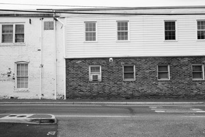 This photograph captures a stark contrast between two architectural styles: the textured, weathered brick wall and the clean lines of the adjoining white building. The mood is contemplative, evoking a sense of stillness in the urban environment, accentuated by the monochromatic palette. Utilizing natural light, the muted tones and subtle shadows enhance the understated beauty of everyday structures.