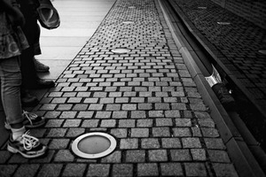 In this stark black and white photograph, the feet of onlookers frame a cobblestone path, hinting at their presence without fully revealing them. The low angle and reflective surface draw the viewer's eye along the pavement, creating an intimate yet distant atmosphere. The interplay of light and shadow adds depth, evoking a sense of contemplation amidst the quiet urban scene.