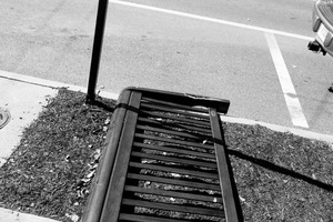 An abandoned bench lies tilted on a patch of grass, casting stark shadows on the asphalt. The monochrome palette enhances the mood of neglect and solitude, while the sharp lines of the composition underscore the tension between the orderly road and the disarrayed seat. Scattered leaves and a hint of street markings add subtle texture, inviting the viewer to ponder the story behind this forgotten space.