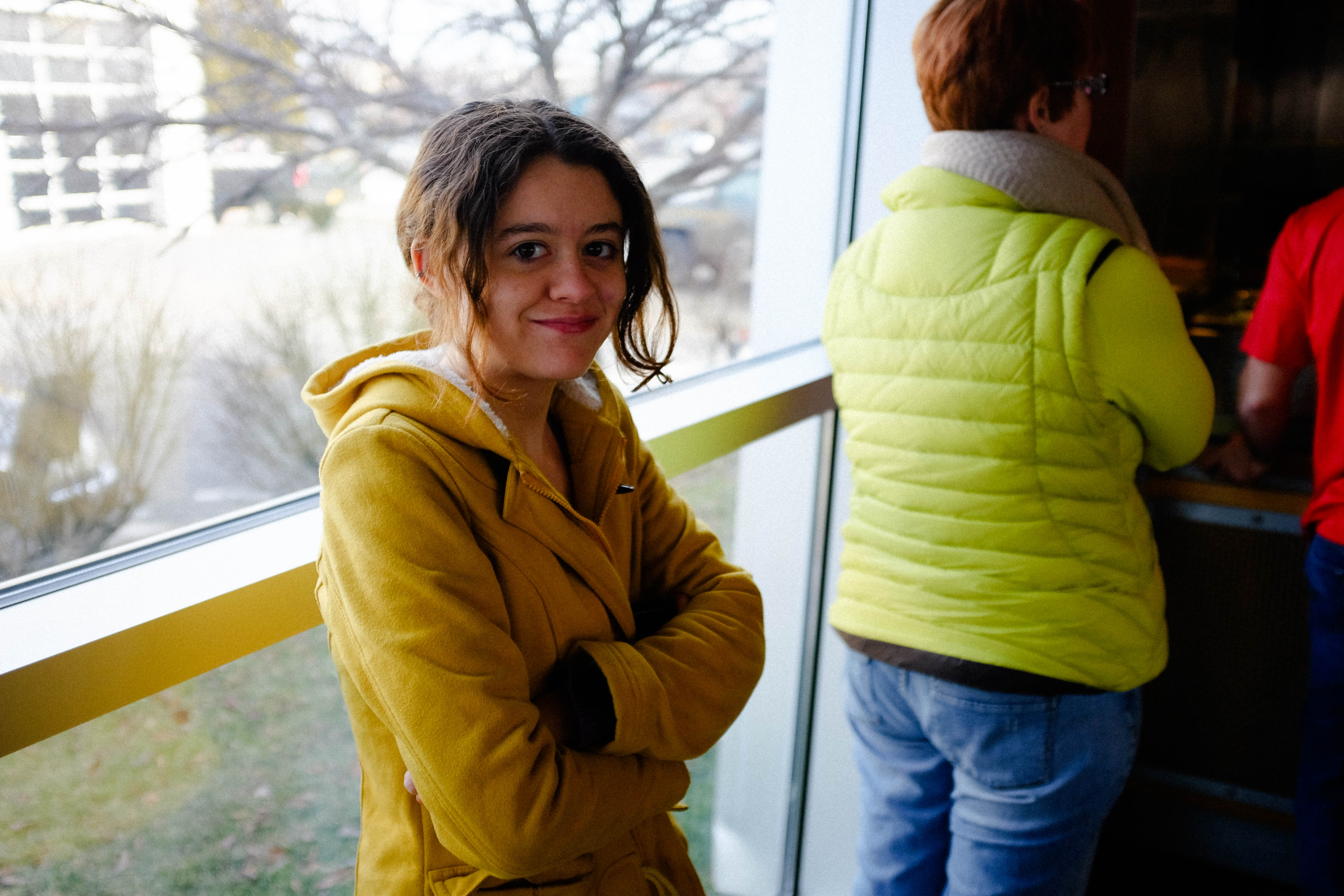 The photograph captures a young woman in a vibrant yellow coat, standing confidently with her arms crossed and a subtle smile on her face. Soft natural light filters in through large windows, creating a warm atmosphere that contrasts with the cool blue tones outside. In the background, figures in muted colors add depth, highlighting her cheerful presence amidst the everyday scene.