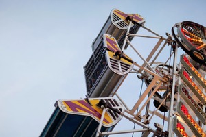 The photograph captures the intricate mechanics of a ferris wheel, rising dramatically against the sky. With a cool, muted palette, the image evokes a sense of nostalgia and anticipation, suggesting both excitement and a hint of whimsy. The dynamic angles and soft evening light enhance the structure's towering presence, inviting viewers to reflect on the thrill of the carnival atmosphere.