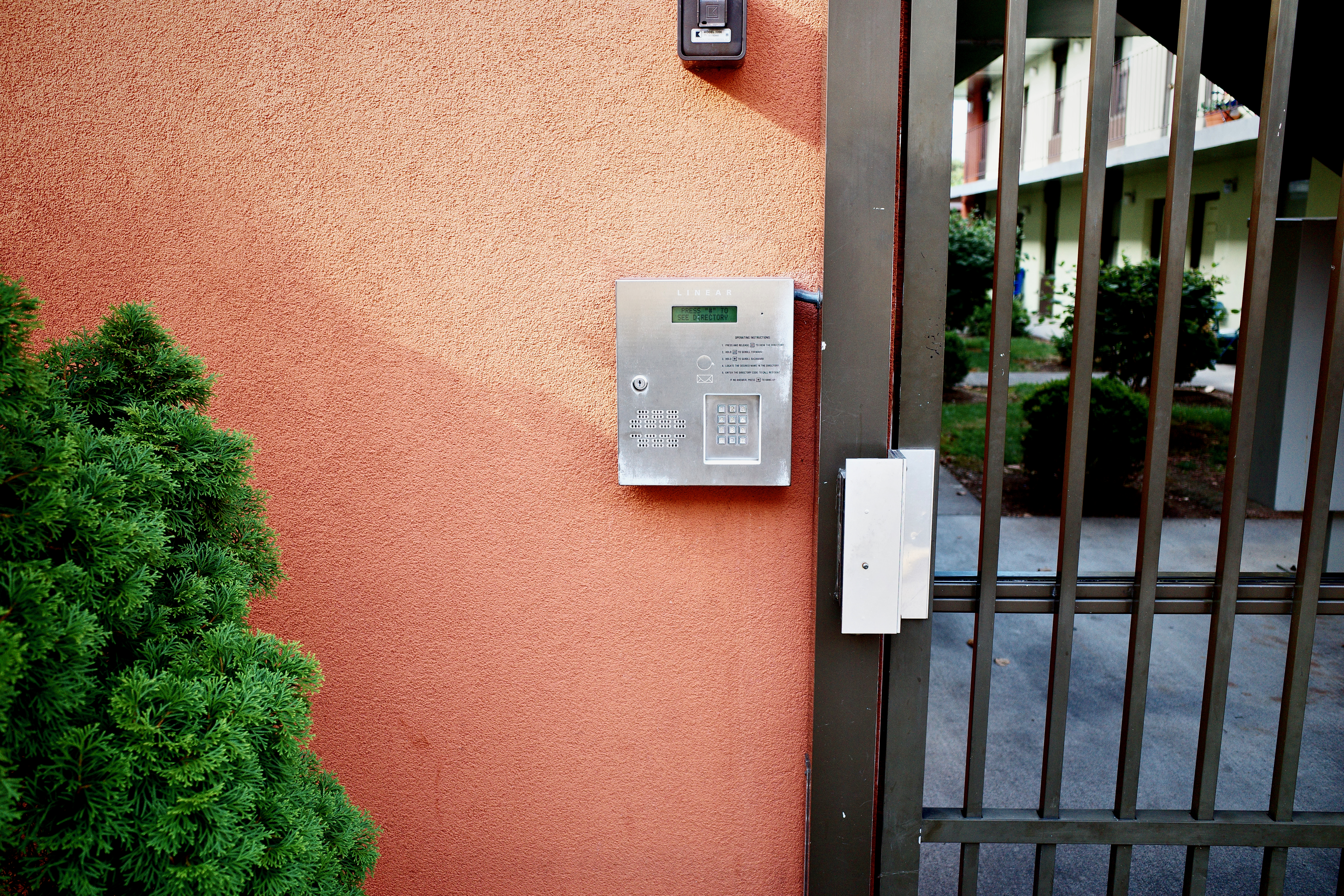This photograph captures an ordinary gated entrance adorned with a sleek intercom panel against a warm, peach-colored wall. The contrasting steel elements and vibrant greenery evoke a sense of cautious welcome, as soft natural light washes over the scene, conveying a tranquil yet secure atmosphere. The composition invites curiosity about what lies beyond the gate, hinting at both accessibility and protection.