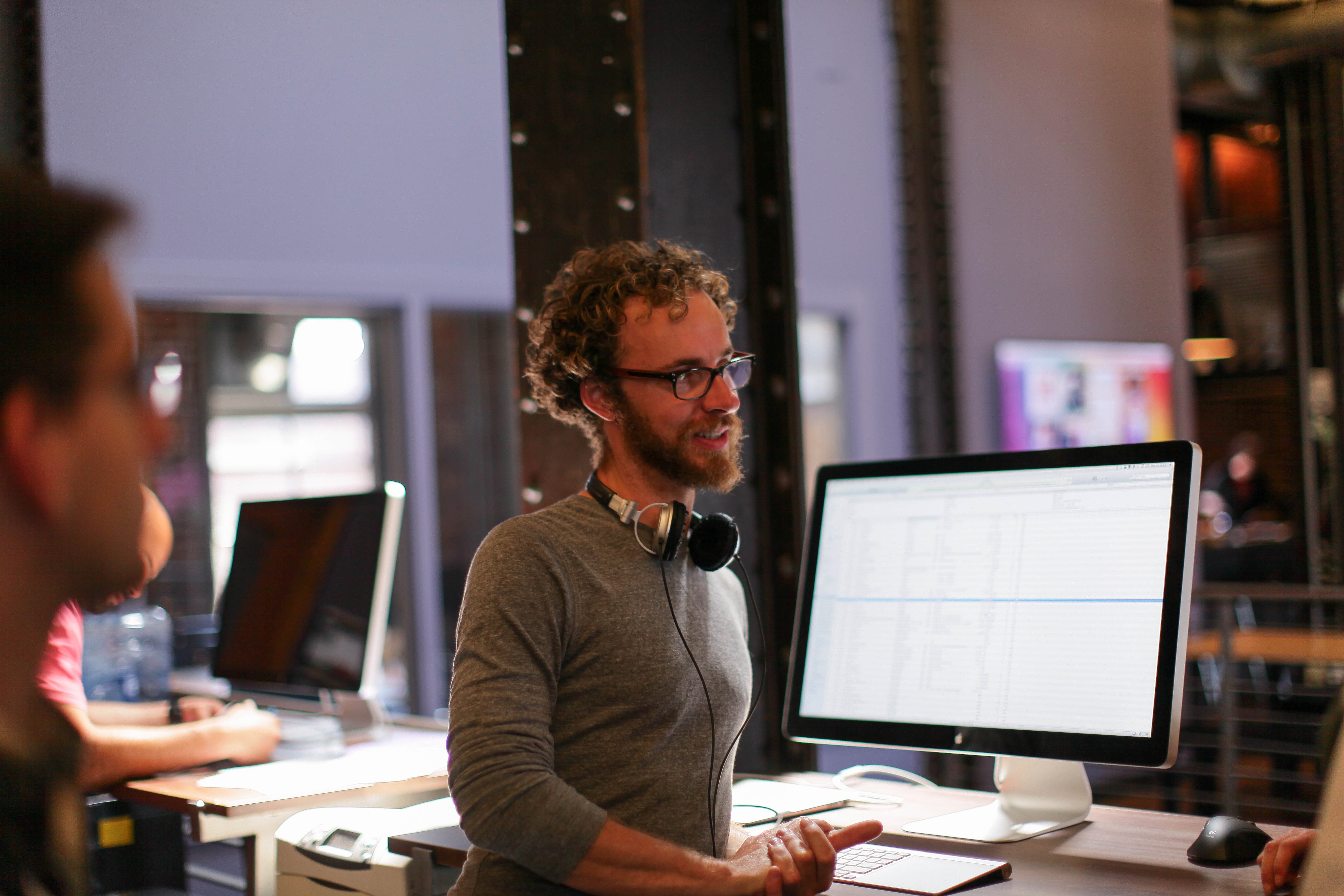 The photograph captures a lively moment in a modern workspace, where a man with glasses and curly hair passionately discusses a project, wearing headphones around his neck. The warm, inviting lighting and open composition enhance the collaborative atmosphere, as others work intently in the background. The mix of technology and human interaction evokes a sense of creativity and teamwork.