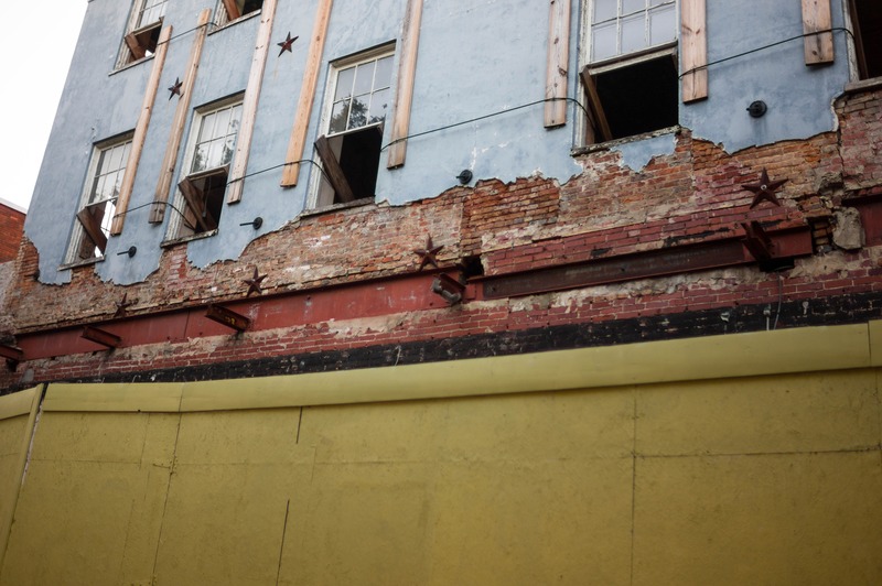 This photograph captures the rugged beauty of an aging building, its blue facade peeling to reveal the exposed bricks beneath. The mood is one of quiet resilience, as the remnants of the structure juxtapose with a vibrant yellow wall in the foreground, hinting at both decay and potential renewal. Natural light softly illuminates the textures and details, inviting contemplation of the stories held within the walls.
