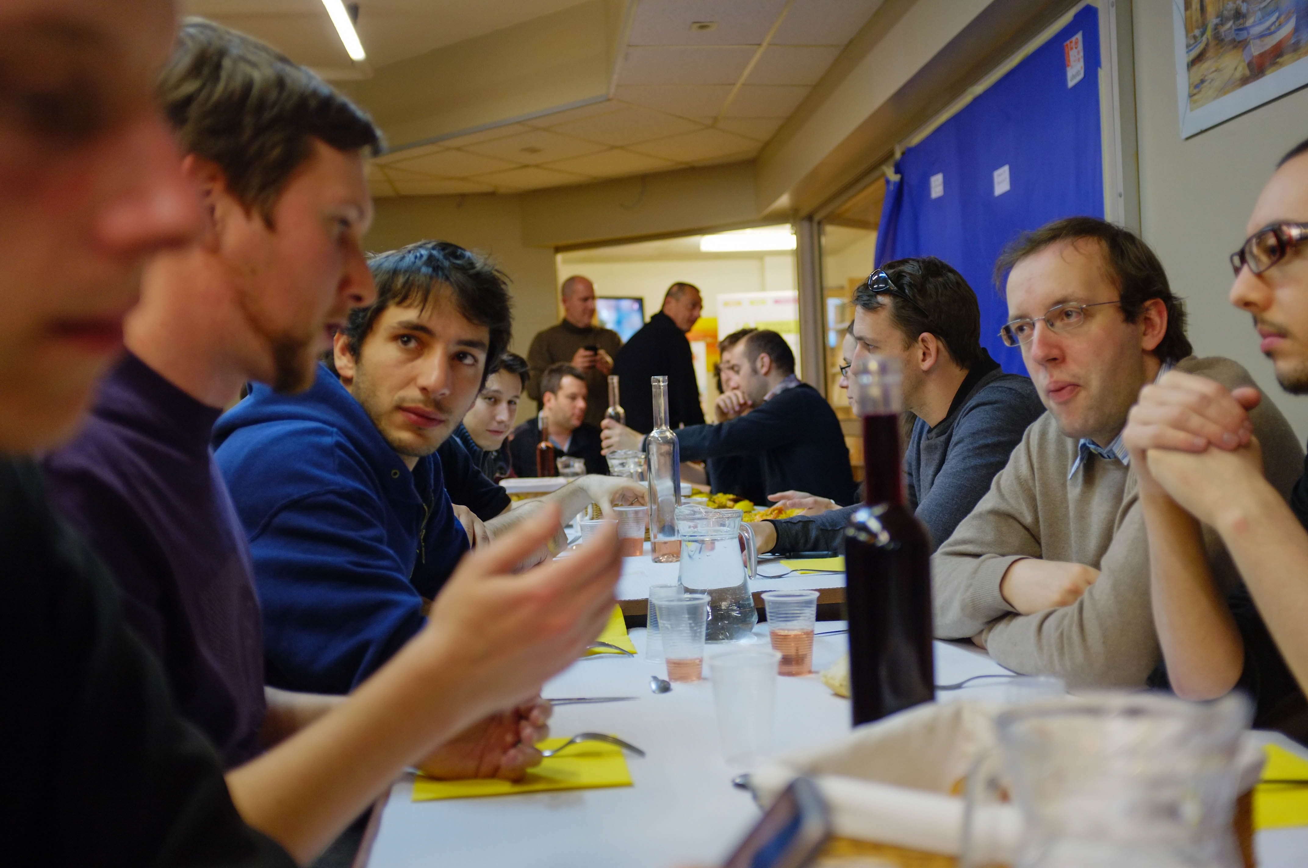 In a warmly lit setting, a group of men is engaged in animated conversation around a long table, their expressions revealing a mix of curiosity and thoughtfulness. The focus on the foreground captures an intimate moment of dialogue, while the blurred figures in the background hint at a lively atmosphere filled with camaraderie and exchange. The use of yellow napkins adds a pop of color, enhancing the inviting and casual mood of the gathering.