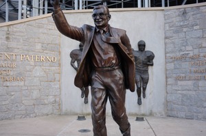 This photograph captures a striking bronze statue of a coach, confidently gesturing with a raised hand as if addressing an audience. The warm, natural light enhances the sculpture's details, emphasizing the coach's determined expression and dynamic pose, set against a textured stone backdrop that adds depth to the composition. The surrounding text hints at a legacy of leadership and inspiration, further enriching the solemn yet motivational mood of the scene.