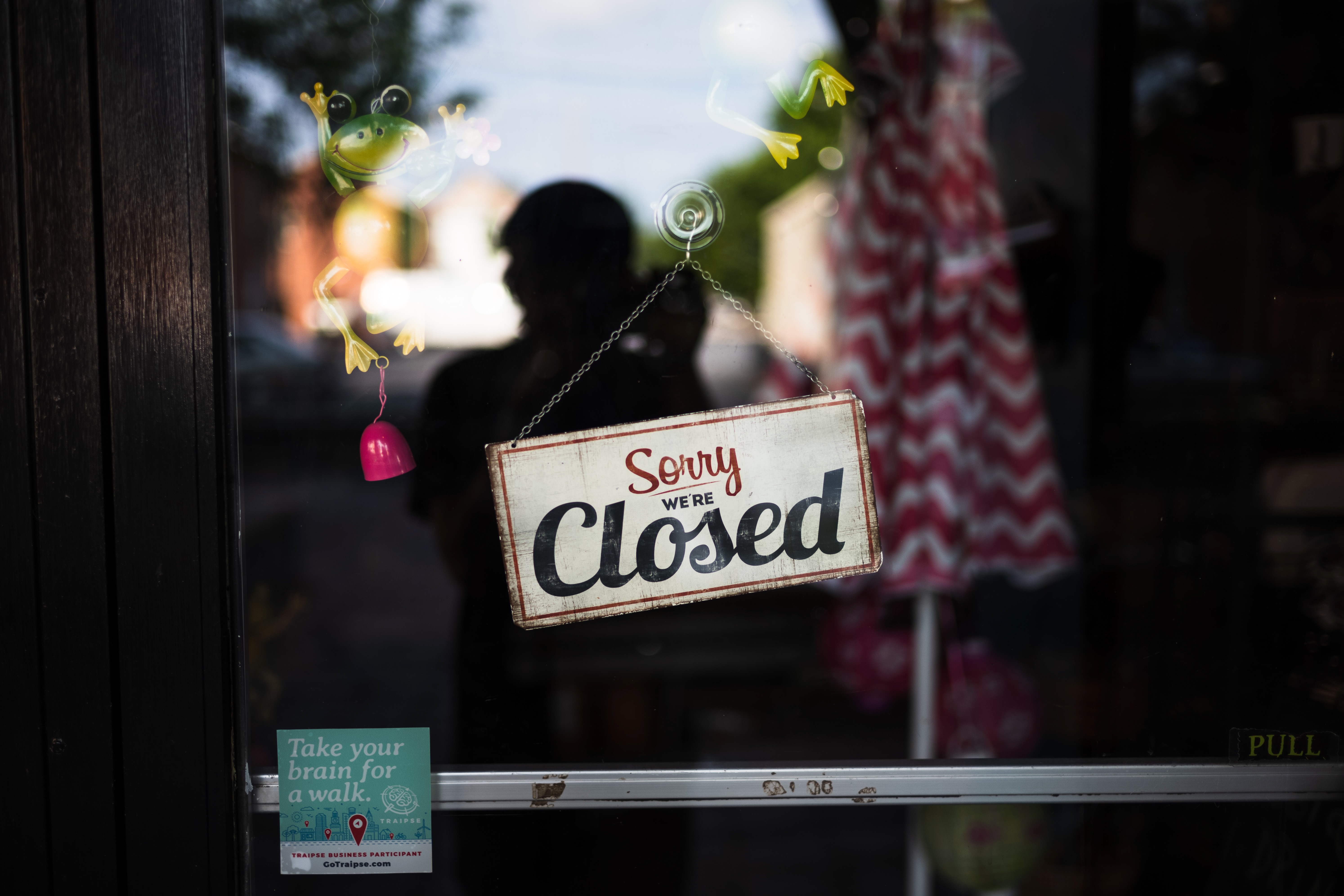 The photograph captures a closed store's entrance with a charming sign reading 'Sorry We're Closed' dangling in the foreground. Soft, warm lighting highlights the reflections in the window, creating a peaceful ambiance that contrasts with the lively decorations of frogs and flowers nearby. This composition evokes a sense of quietude, inviting curiosity about the stories held within the locked space.
