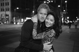 In this striking black and white photograph, a couple stands closely together amidst a softly lit urban night backdrop. Their joyful expressions radiate warmth, contrasting with the cool tones of the surrounding cityscape. The composition draws attention to their affectionate pose, creating an intimate moment that feels both spontaneous and cinematic.