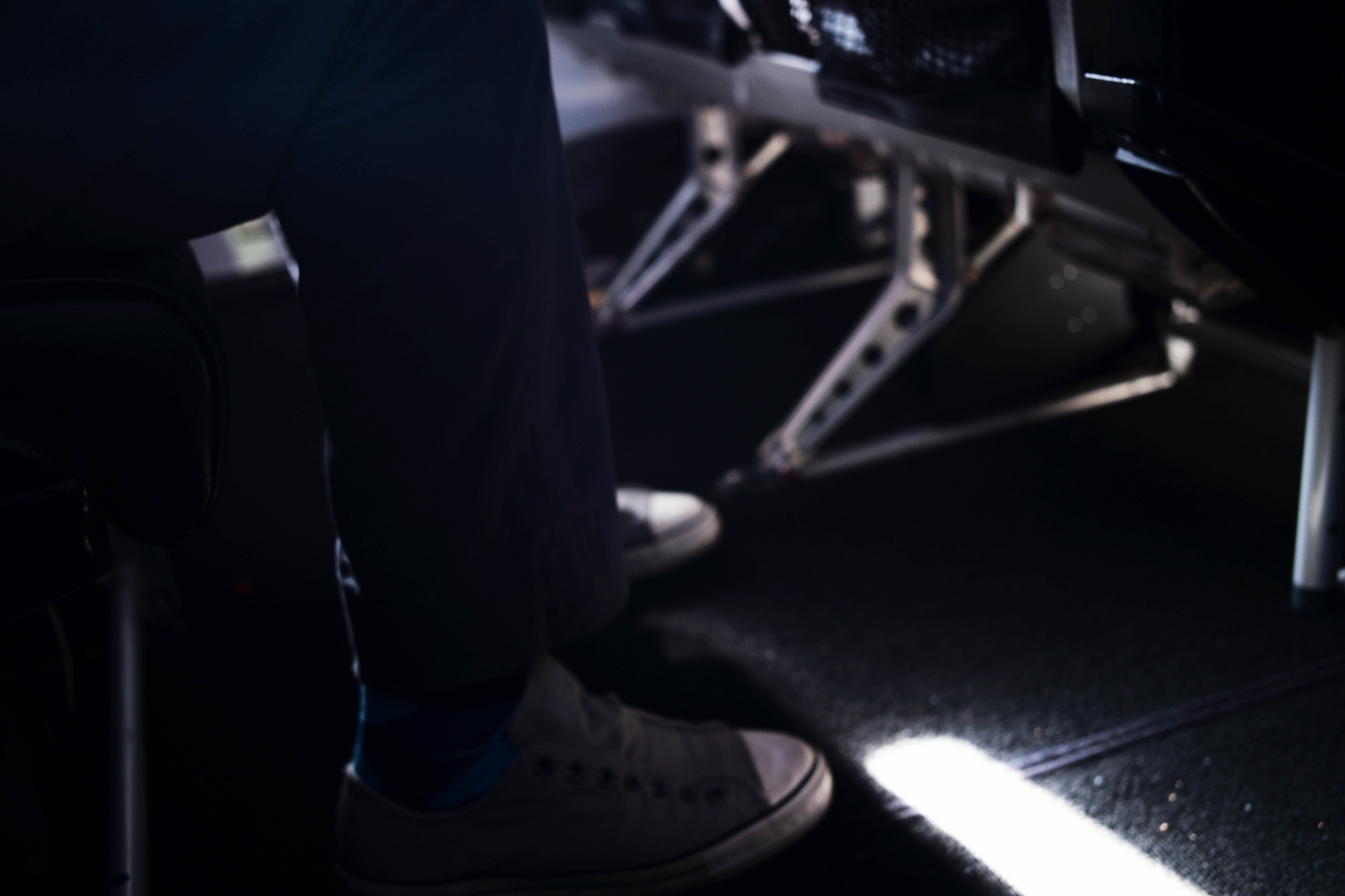 A solitary foot rests on the dark carpet of an aircraft cabin, subtly illuminated by a beam of light cutting through the shadows. The composition focuses closely on the shoe and pant leg, evoking a sense of contemplation and stillness amidst the movement of travel. The interplay of light and darkness creates a quiet, introspective mood, suggesting moments of reflection during a journey.