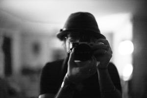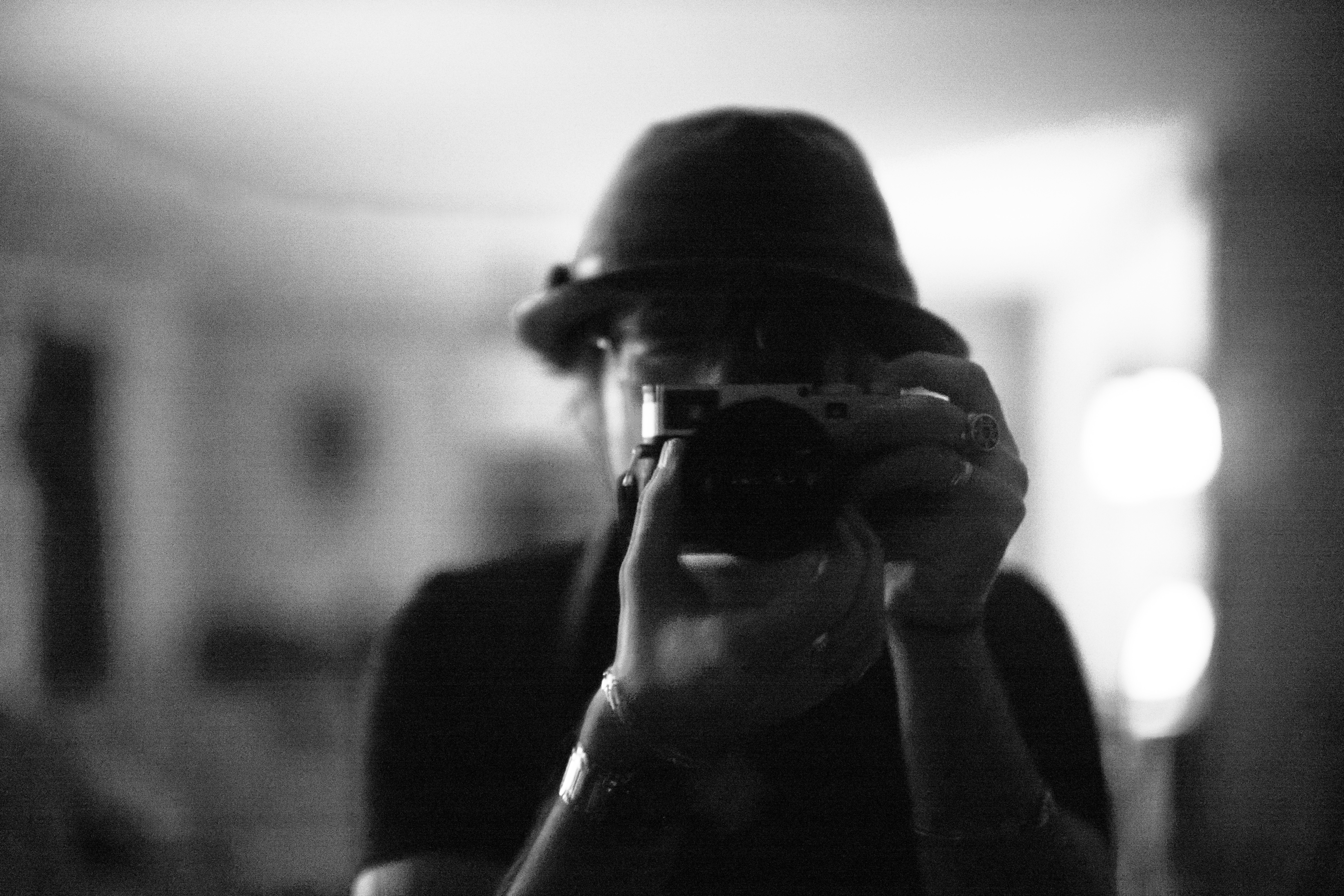 In this poignant monochrome photograph, a figure captures their own image through a camera, adorned with a sleek fedora and a contemplative expression. The soft, diffused lighting creates an intimate atmosphere, accentuating the reflective nature of the scene. The blurred background hints at a lived-in space, adding a layer of mystery and warmth to this moment of self-exploration.