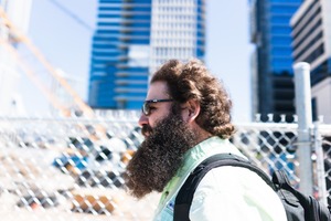 A bearded man with stylish sunglasses strides purposefully past a construction site, framed by towering city skyscrapers. The bright sunlight emphasizes the textures of his beard and his light green shirt, creating a vibrant contrast against the cool, modern architecture. The composition captures a moment of urban hustle, blending human presence with the dynamic backdrop of a city in progress.