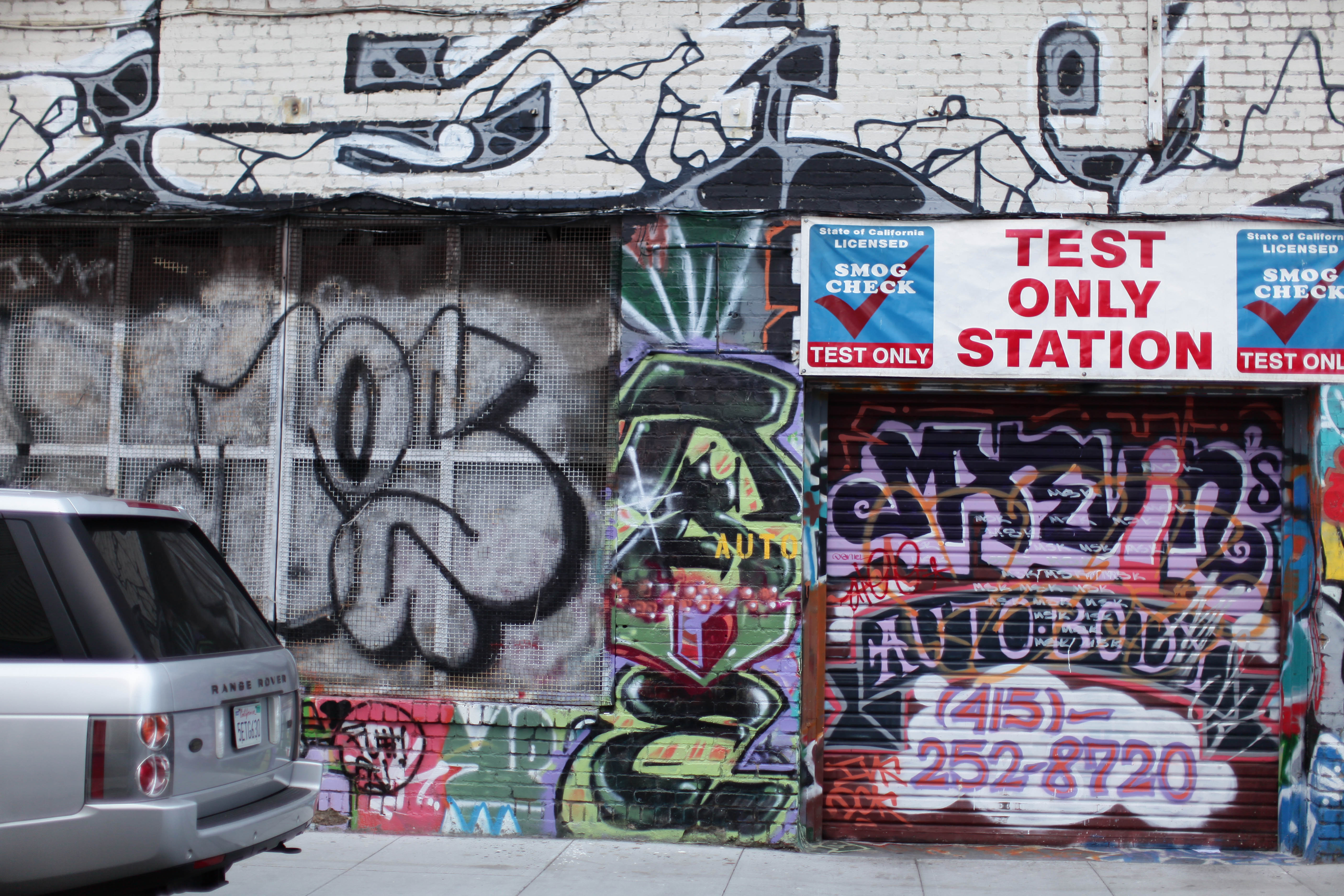 This photograph captures a vibrant street scene dominated by a kaleidoscope of graffiti art on a weathered brick wall. The contrast between the colorful tags and the stark signage of a smog check station evokes a sense of urban energy and creative rebellion. Soft daylight illuminates the textures, enhancing both the gritty charm and the spontaneity of the space.