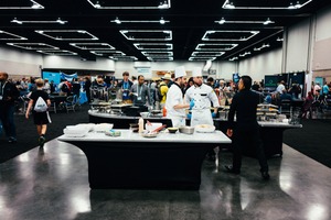In a bustling convention center, chefs in pristine uniforms engage in animated conversation while serving a diverse crowd milling about. The modern, fluorescent lighting enhances the dynamic atmosphere, contrasting the dark, polished floor that reflects the ongoing activities. The scene captures a blend of culinary artistry and communal energy amid the backdrop of an event filled with eager participants.