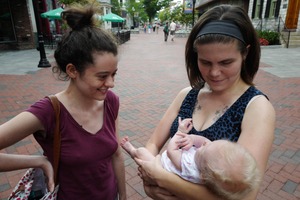 In this candid photograph, two women share a heartwarming moment as they admire a baby nestled in one of their arms. The warm, diffused light casts a gentle glow on their faces, enhancing the intimacy of the scene against a lively but distant urban backdrop, filled with gentle motion. The composition draws the viewer’s eye to the expressions of joy and connection, creating a sense of warmth and camaraderie amid the bustling environment.