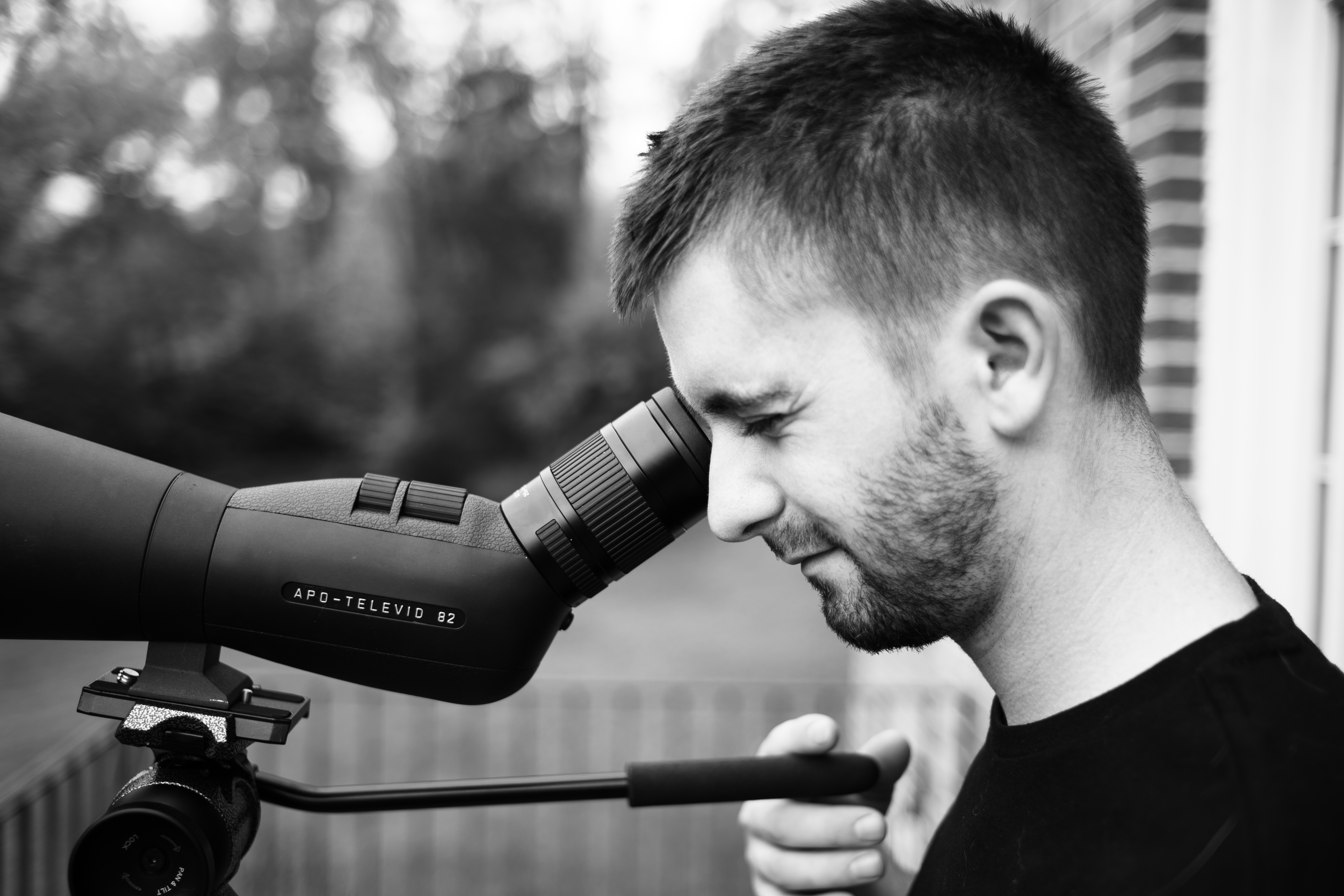 A young man gazes intently through a high-quality telescope, his expression focused yet serene. The black-and-white composition enhances the mood of contemplation, while the soft background blurs distractions, directing the viewer’s attention to his connection with the instrument. Subtle natural light adds an air of tranquility to the scene, embodying a sense of discovery and wonder.