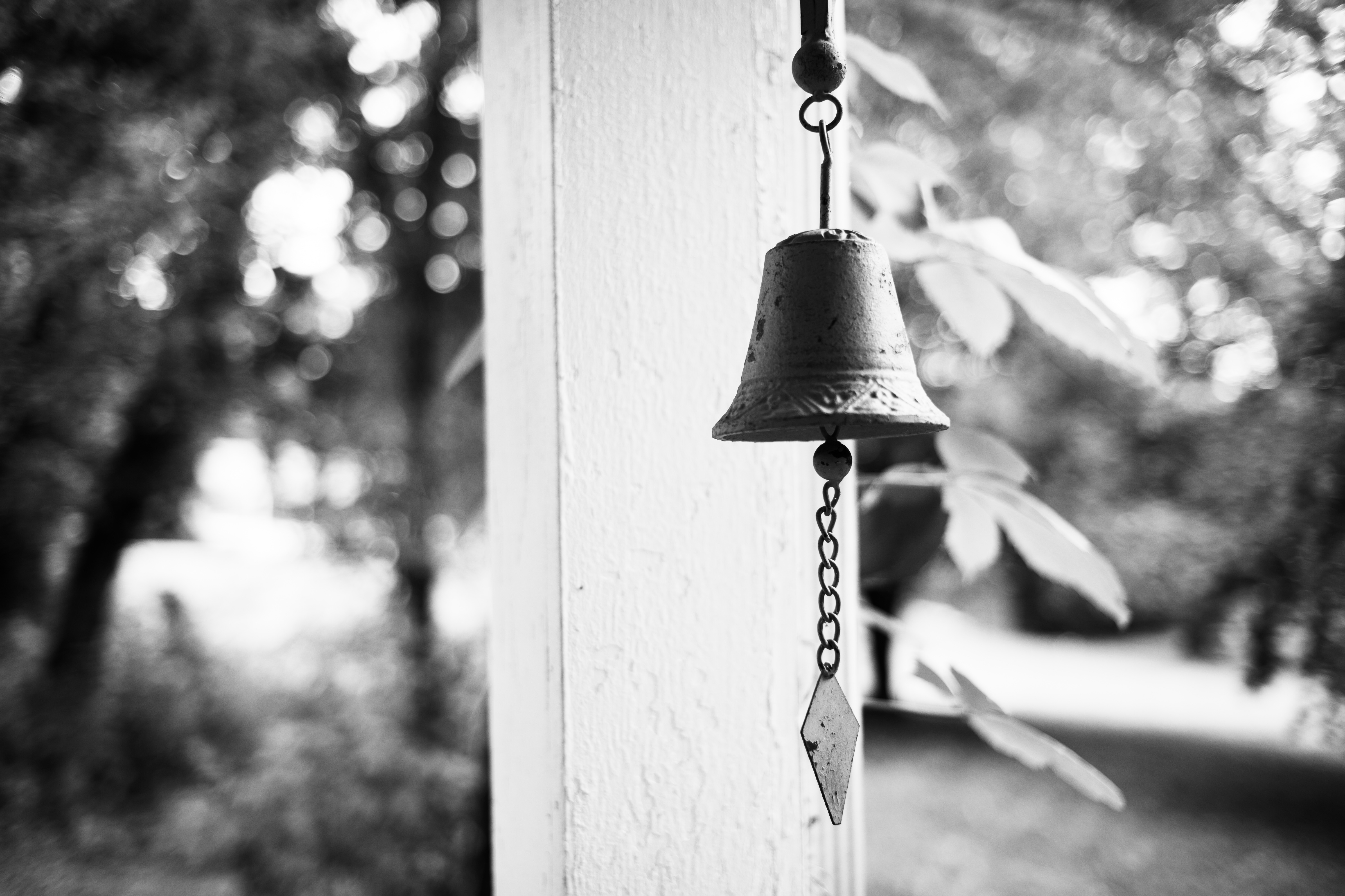 A solitary bell hangs against a softly blurred backdrop, its antique charm captured in stark black and white. The gentle play of light and shadow draws the eye to the intricate details of the bell, exuding a sense of nostalgia and tranquility. Its poised stillness amidst the surrounding foliage evokes a serene mood, inviting contemplation and reflection.