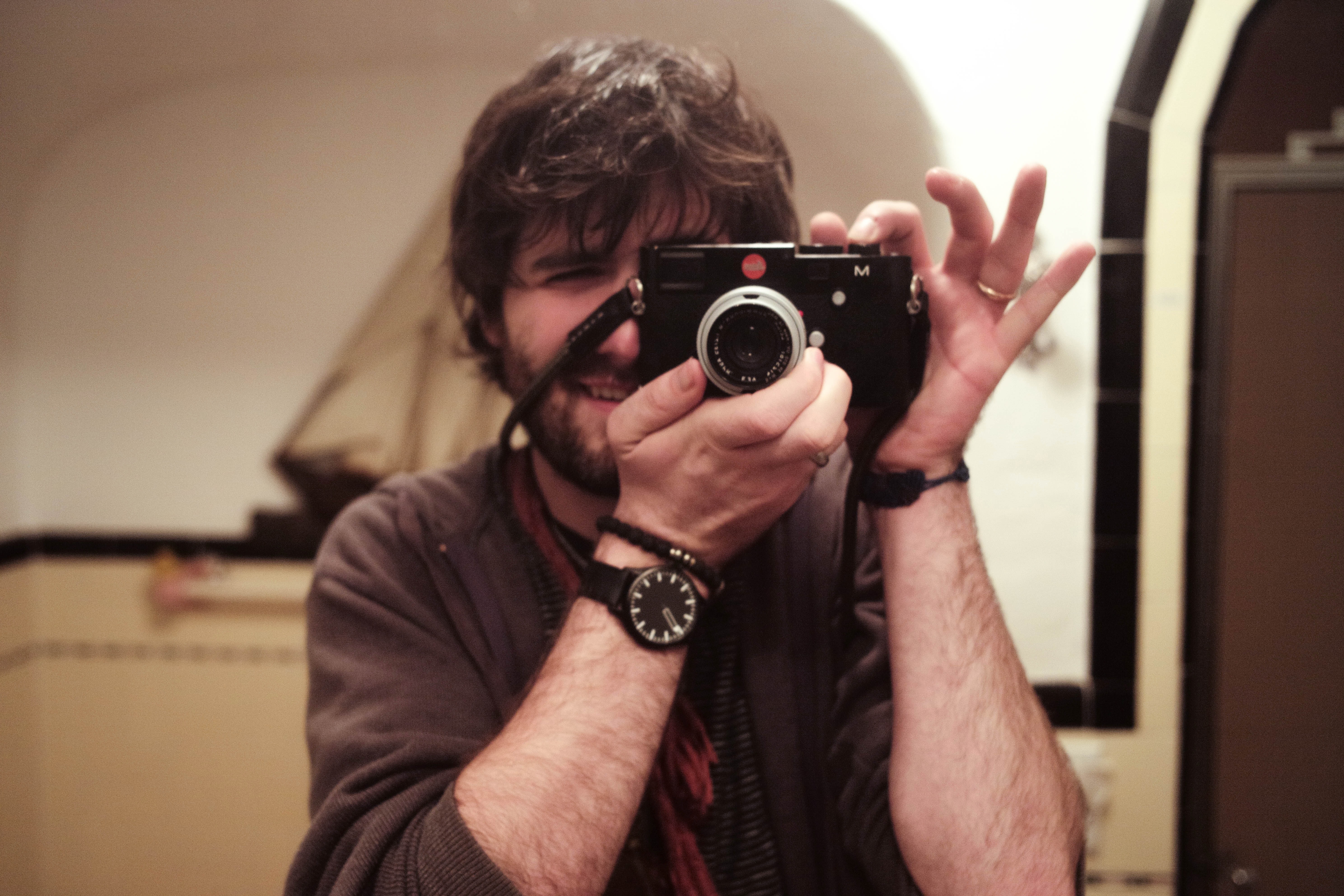 The photograph captures a young man smiling playfully while holding a camera, likely taking a selfie in a softly lit bathroom. The warm lighting creates an inviting and intimate mood, enhancing the casual yet creative atmosphere. Reflections and textures in the mirror add depth, drawing the viewer into a personal moment of self-expression and spontaneity.