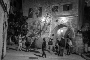 In a dimly lit alley, a diverse group of people congregates around a peculiar installation featuring a tree suspended from a large stone. The warm glow from the nearby lanterns casts soft shadows, enhancing the intimate yet curious atmosphere. The stark contrast of the black and white tones emphasizes the texture of the ancient stone walls, creating a sense of timelessness amidst the lively interaction.
