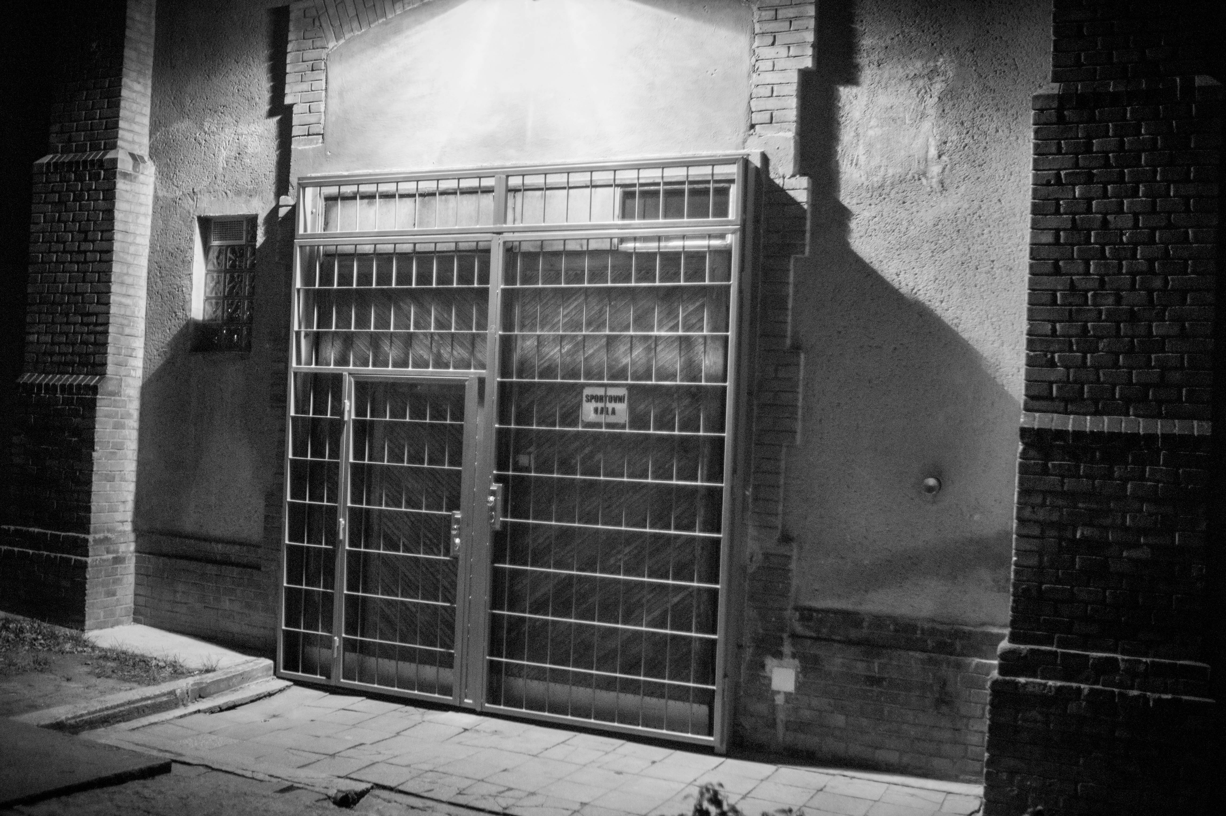 The photograph captures a stark metal gate illuminated by a piercing light, casting dramatic shadows against the rough-textured brick wall. The monochrome palette enhances the somber mood, evoking a sense of both isolation and intrigue. This composition, with its strong contrasts and geometric lines, draws the viewer's eye toward the mysterious entrance, leaving a haunting impression.