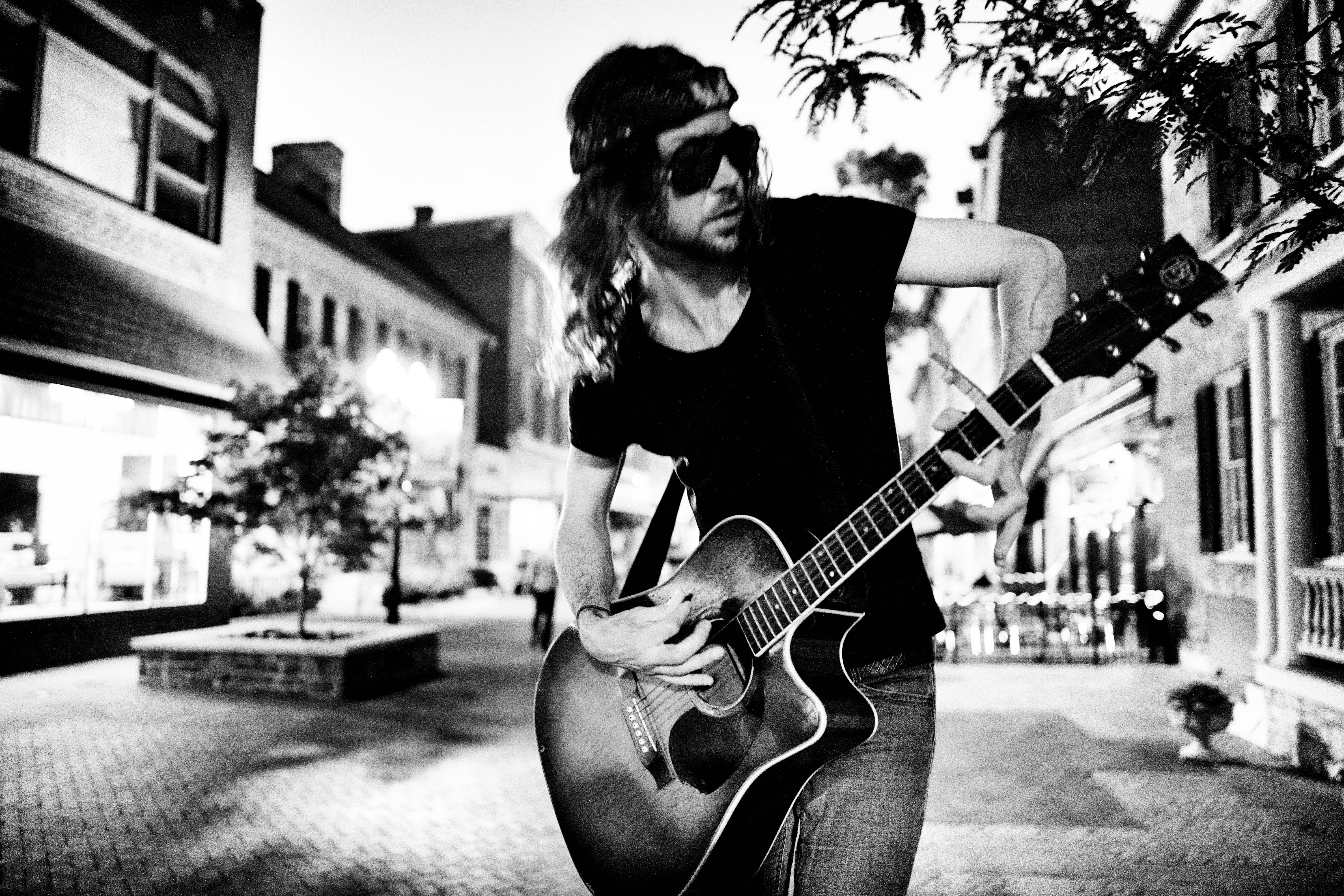In this evocative black-and-white photograph, a musician passionately plays an acoustic guitar in a dimly lit street. The intimate urban setting is enhanced by soft, glowing lights in the background, creating a moody atmosphere that captures the essence of nighttime creativity. The dynamic composition draws the viewer's eye to the musician's focused expression and expressive movement, highlighting a moment of artistic dedication.