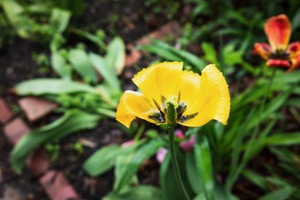 A vibrant yellow tulip takes center stage, kissed lightly by raindrops that glimmer in the soft light. Surrounded by lush greenery and hints of other blooms, the composition draws the eye upwards, evoking a sense of freshness and renewal. The mood is joyful and serene, encapsulating the beauty of nature after a refreshing rain shower.