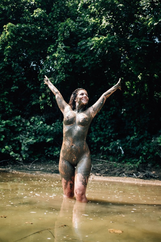 In a vibrant natural setting, a woman stands joyfully in a muddy body of water, arms outstretched as if embracing the elements. The sunlight filters softly through the trees, casting a warm glow on her playful expression, creating an atmosphere of freedom and connection with nature. The earthy tones of the mud contrast with the lively greens of the foliage, highlighting the raw beauty of the moment.