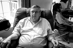In this striking black and white photograph, a middle-aged man sits comfortably in a recliner, exuding a sense of calm and introspection. The soft lighting bathes him in a warm glow, contrasting with the relaxed chaos of a gathering behind him, where others engage quietly in the background. The composition draws the viewer's eye to his contemplative expression and the ease of his posture, capturing a moment of quiet reflection amid social interactions.