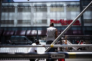 In this photograph, workers frame a bustling urban scene, their figures partially obscured by scaffolding. The bright midday sun casts sharp shadows and highlights their labor, while the backdrop of the Burlington Coat Factory adds a commercial context. The composition contrasts the industrious activity with the stillness of city life beyond the barriers.