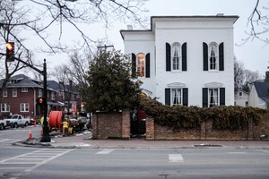 A striking white house with dark shutters stands prominently at a street intersection, partially obscured by a lush green hedge. The soft winter light casts a serene glow on the scene, contrasting with the bustling activity of construction vehicles parked nearby. A solitary red light at the crosswalk heightens the sense of pause amidst the quiet urban landscape.