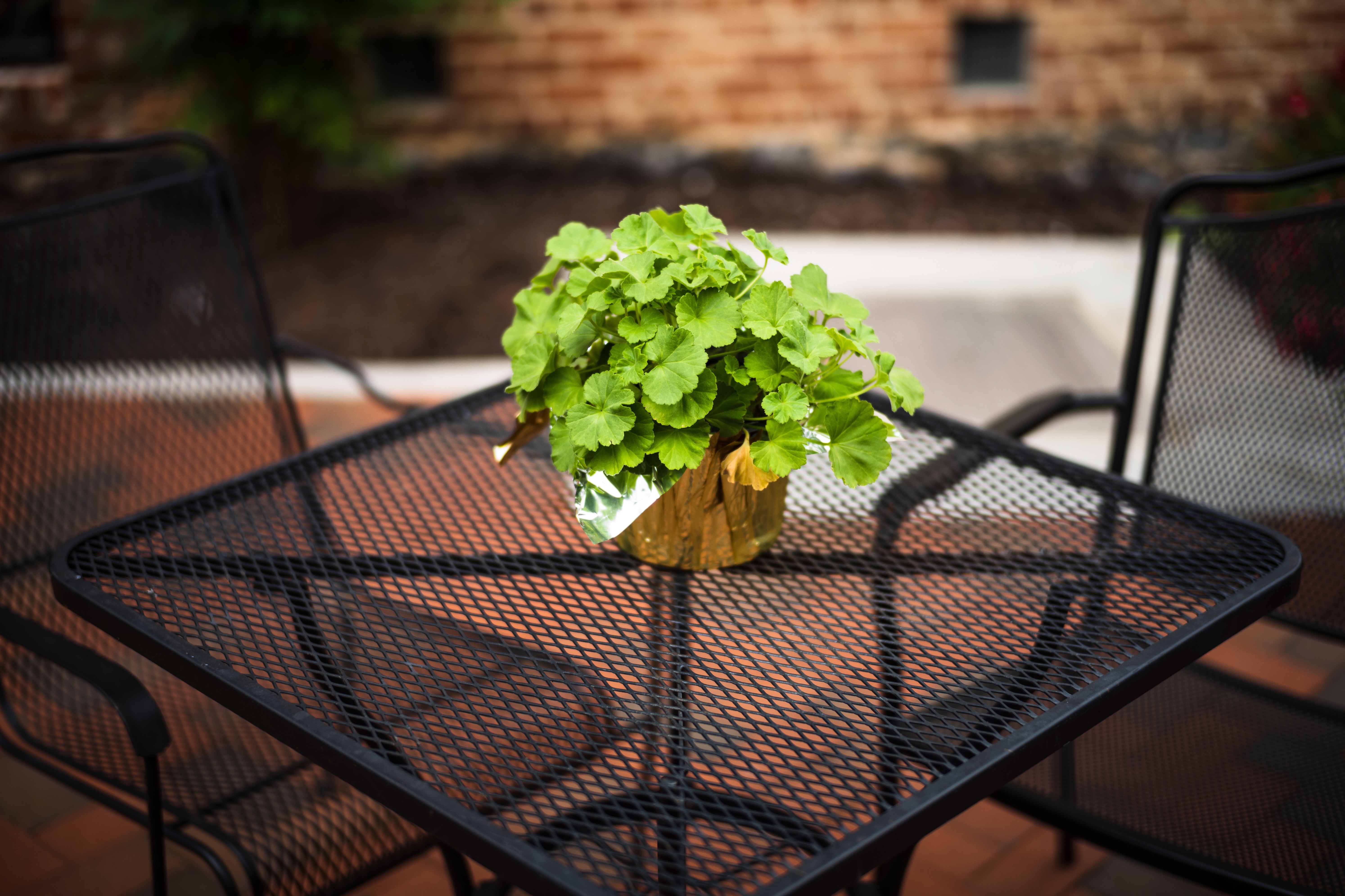 A vibrant green plant sits atop a sleek black mesh table, inviting tranquility to the scene. The warm lighting enhances the fresh hues of the leaves, creating a harmonious contrast with the rustic brick background. The composition, with empty chairs flanking the table, evokes a sense of peaceful solitude and a beckoning for moments of reflection.