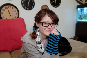A young woman sits comfortably on a couch, her playful expression exuding warmth and charm. Surrounded by clocks and hints of home life, the soft lighting creates an inviting atmosphere, highlighting her striped gloves and thoughtful pose.
