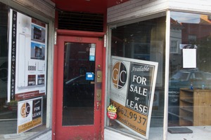 This photograph captures the entrance of a vacant storefront, framed by a vibrant red door that stands out amidst the muted surrounding colors. The signs advertising the space for lease convey a sense of abandonment, while the warm natural light highlights the dust motes in the air, creating a nostalgic and contemplative mood. The composition draws the viewer's eye to the door, hinting at the potential stories waiting to unfold behind it.