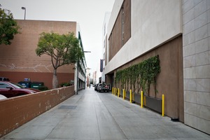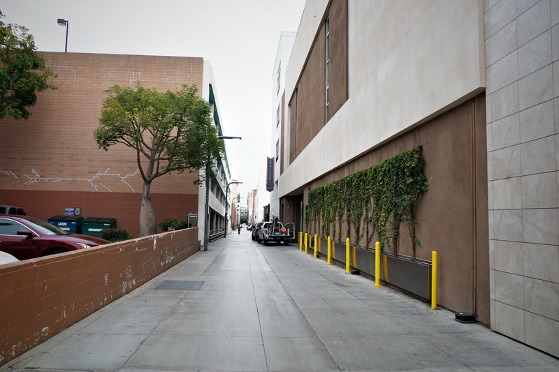 The photograph captures a narrow urban alley, flanked by modern buildings and a tangle of greenery creeping up a brown wall. The muted lighting conveys a sense of calm, with the absence of people enhancing the feeling of solitude. The yellow poles create a striking contrast against the earthy tones, inviting the eye to explore the quiet passageway further.